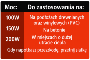 • Temperatura grzania: 100 W/m² – ok. 40–60°C
